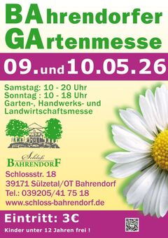 Auch im Jahr 2026 wird die Bahrendorfer Garten- und Handwerkermesse am 2. Maiwochenende stattfinden. Denken Sie dran, am 10.05. ist Muttertag. Der Park lädt zum Spazierengehen und Kaffee und Kuchen essen ein. Wir freuen uns auf Ihren Besuch.